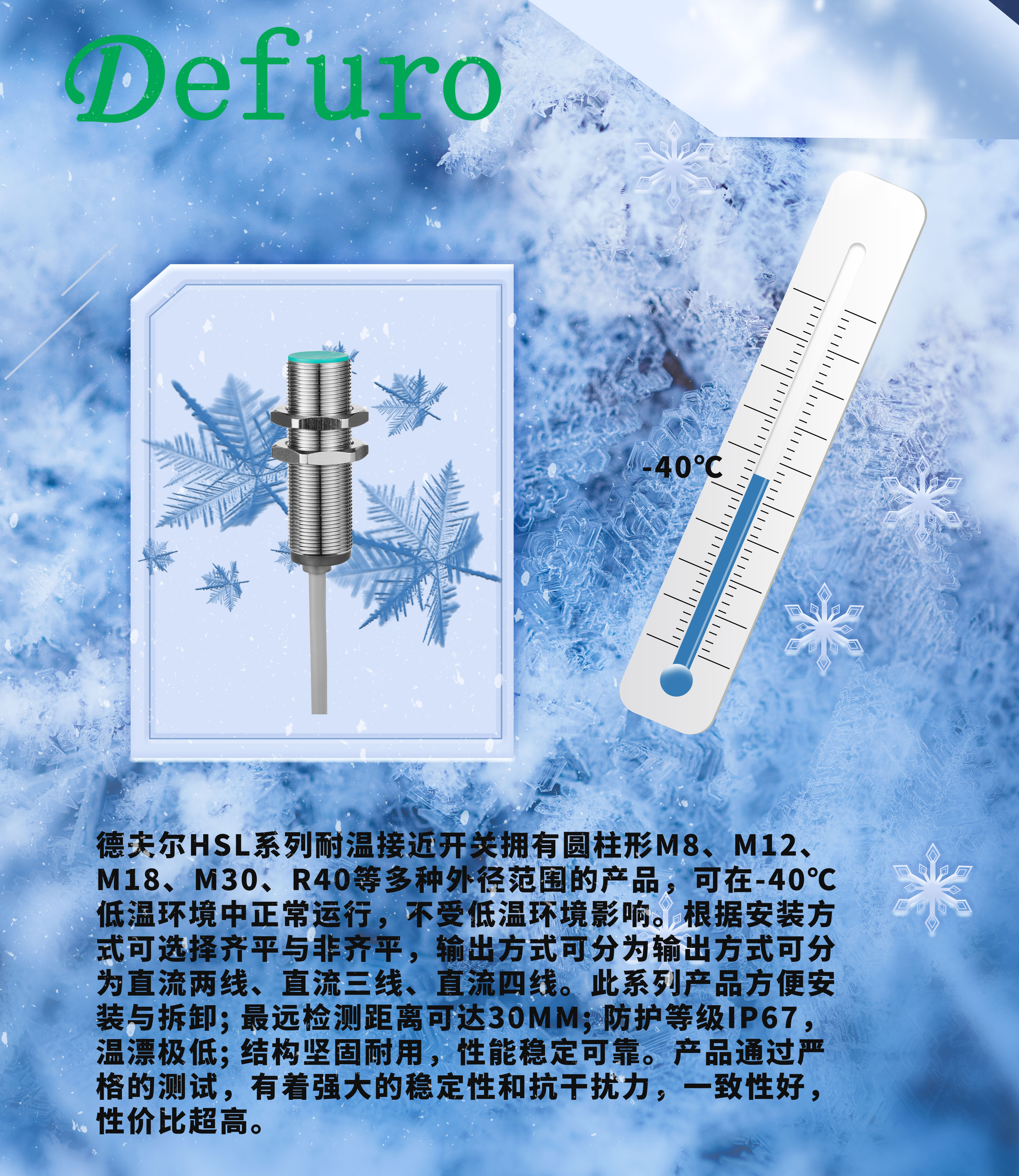 查看詳情>>德夫爾HSL系列耐溫接近開關擁有圓柱形m8、M12、M18、M30、R40等多種外徑范圍的產品,可在-40℃低溫環(huán)境中正……